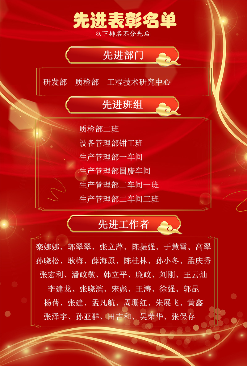 為表彰先進(jìn),樹立楷模,1月24日下午,公司2021年度先進(jìn)表彰儀式在研發(fā)中心會(huì)議室隆重舉行,儀式現(xiàn)場對先進(jìn)工作者、先進(jìn)班組、先進(jìn)部門進(jìn)行表彰嘉獎(jiǎng)。公司董事長、總經(jīng)理張新功,公司各級經(jīng)營管理干部及先進(jìn)工作者、先進(jìn)班組及部門代表參加了儀式。
