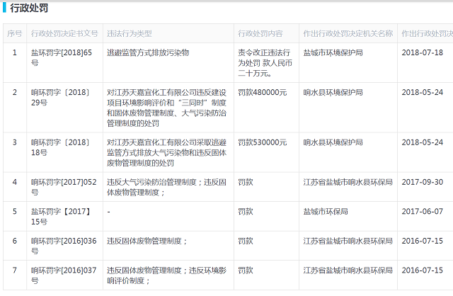 經(jīng)啟信寶查詢(xún),2018年5月24日,天嘉宜化工被響水縣環(huán)境保護(hù)局處罰,[響環(huán)罰字〔2018〕29號(hào)]決定文書(shū)介紹,依據(jù)《建設(shè)項(xiàng)目環(huán)境保護(hù)管理?xiàng)l例》第二十三條、《中華人民共和國(guó)環(huán)境影響評(píng)價(jià)法》第三十一條、《中華人民共和國(guó)大氣污染防治法》第一百零七條、《中華人民共和國(guó)固體廢物污染環(huán)境防治法》第七十五條,天嘉宜化工被罰款480000元。最近的一次是2018年7月18日,因逃避監(jiān)管方式排放污染物,被鹽城市環(huán)境保護(hù)局責(zé)令改正違法行為,并處罰款人民幣20萬(wàn)元。