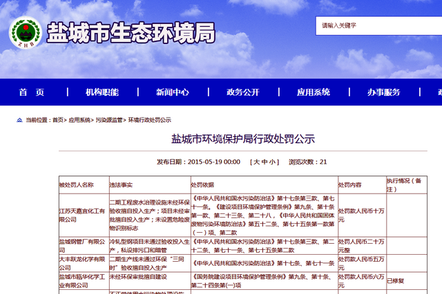 鹽城市環(huán)境保護(hù)局2015年5月19日公布的行政處罰公示顯示,江蘇天嘉宜化工有限公司二期工程廢水治理設(shè)施未經(jīng)環(huán)保驗(yàn)收擅自投入生產(chǎn);未設(shè)置危險(xiǎn)廢物識(shí)別標(biāo)志,處罰款人民幣10萬(wàn)元。