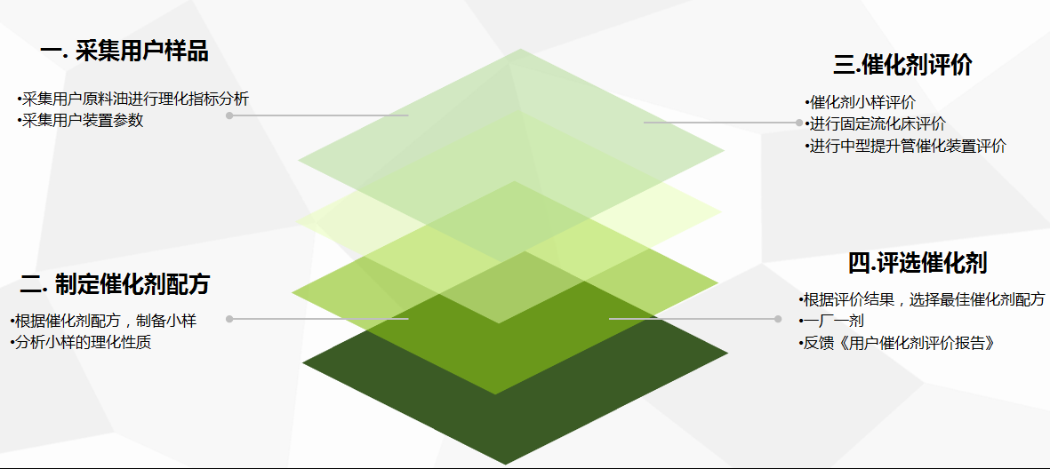 銷售人員負(fù)責(zé)售前采集客戶生產(chǎn)工藝數(shù)據(jù)、原料油樣品等,然后交由技術(shù)服務(wù)中心分析,研發(fā)部根據(jù)分析結(jié)果制備催化劑小樣,通過重油微反實驗裝置、固定流化床實驗裝置和中型提升管催化裂化裝置,對催化劑配方篩選和工藝效果實施三級評價,根據(jù)評價結(jié)果靈活調(diào)整催化劑配方重復(fù)試驗并選定最優(yōu)方案交由生產(chǎn)管理部實施定制化生產(chǎn)。